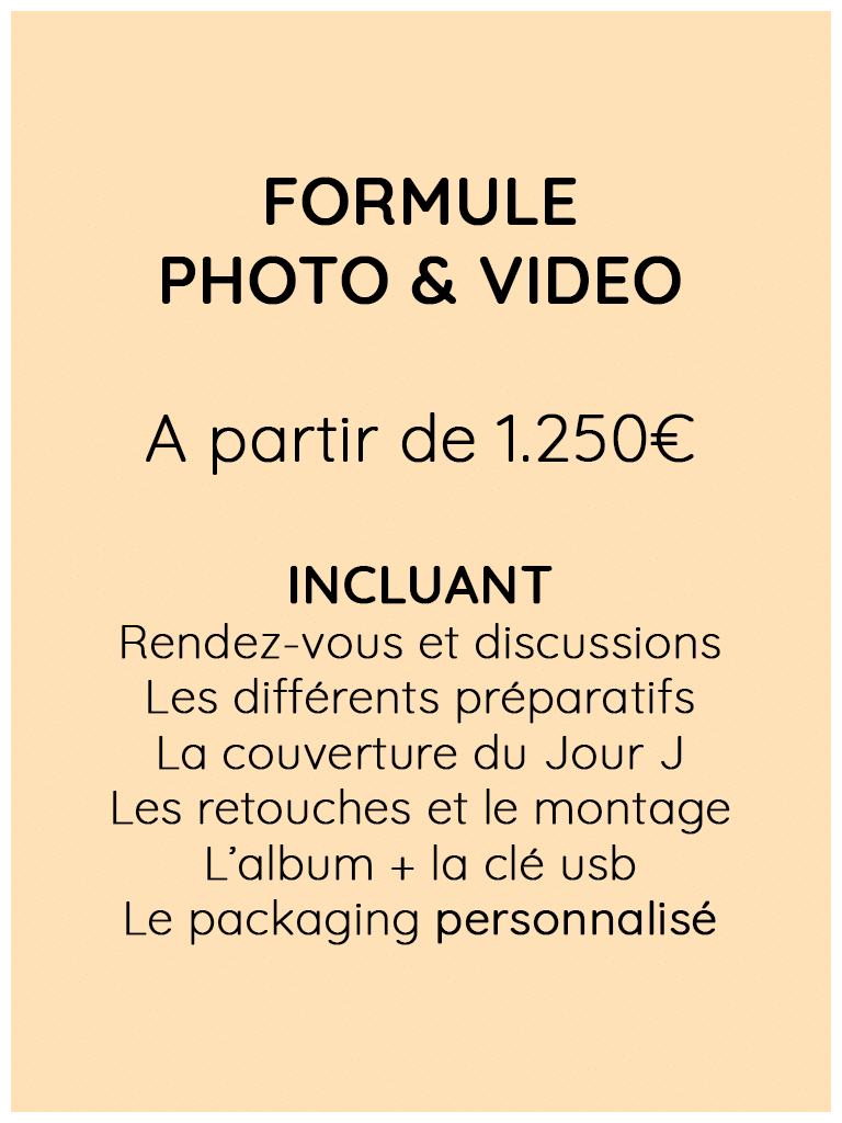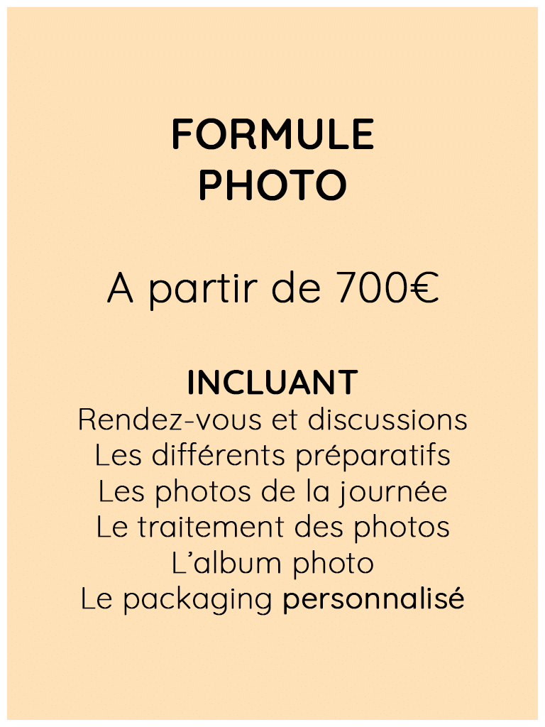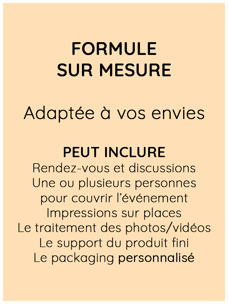 Nous vous proposons 4 FORMULES, mais chacune peut être adaptée: par exemple si vous ne souhaitez qu’une personne pour la soirée, si vous souhaitez que votre entourage reparte avec une photo souvenir le jour même, c’est possible aussi. Tant que tout est prévu suffisamment à l’avance.